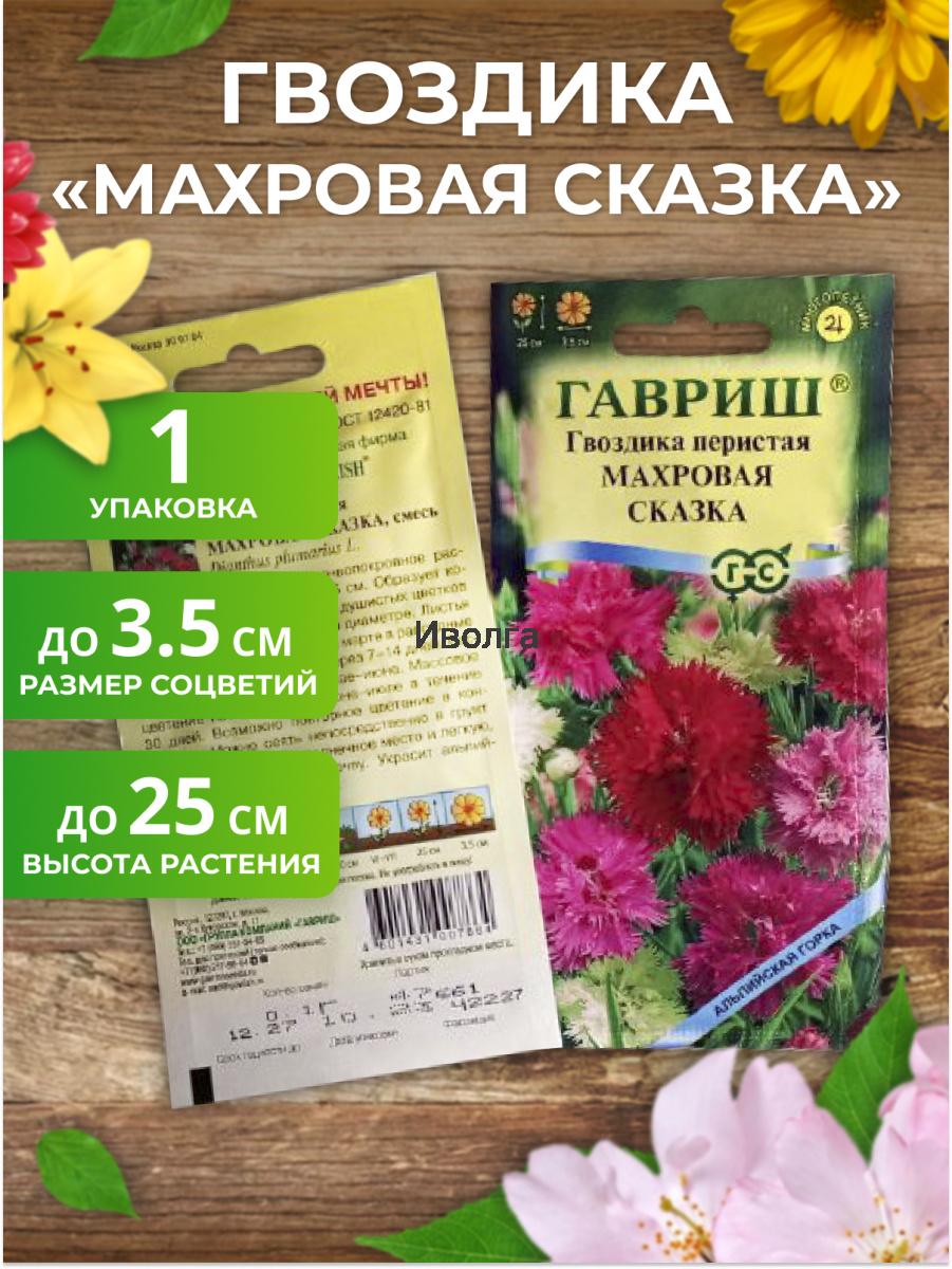 Гвоздика перистая "Махровая сказка" - многолетнее почвопокровное растение высотой 25 см. Образует ковер из махровых душистых цветков различной окраски до 3,5 см. в диаметре. Листья имеют сизый налет. Посев в январе-марте в рассадные ящики. Всходы появляются через 7-14 дней.